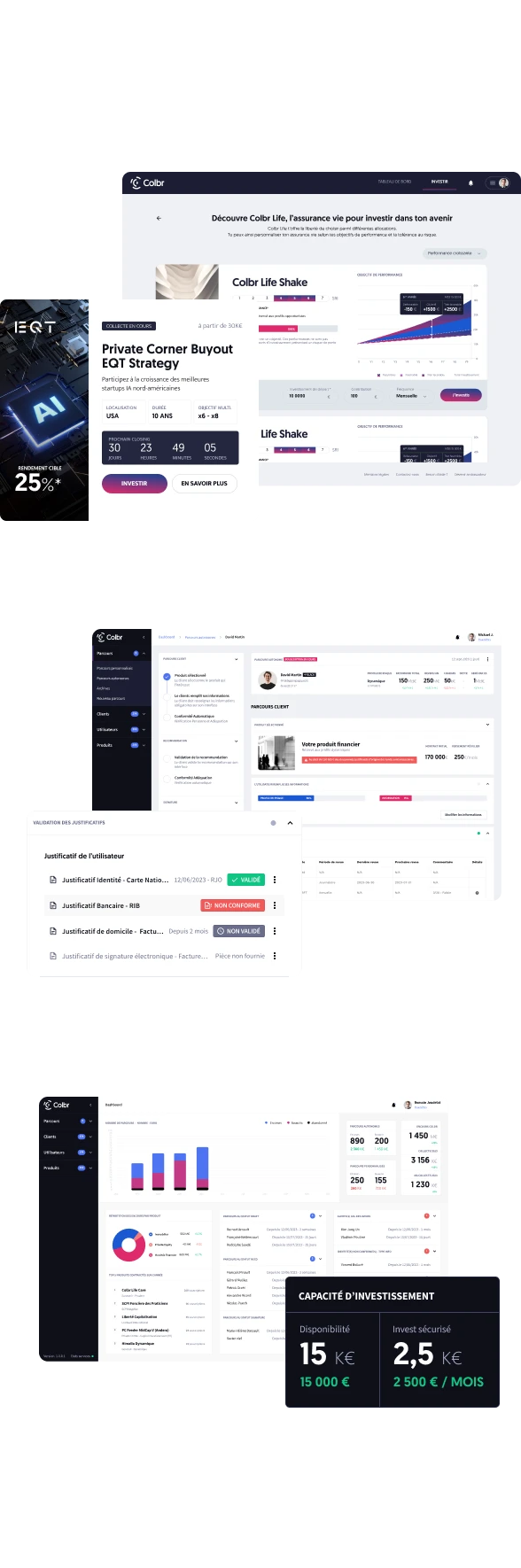 Une solution complète pour renforcer la relation client : accédez à un dashboard patrimonial unifié, à des outils de conseil assisté (questionnaires, capacité d’investissement en temps réel) et à une GED intégrée pour simplifier vos échanges. Colbr vous fait gagner du temps opérationnel, professionnalise vos reportings et vous aide à offrir une expérience premium à vos clients.